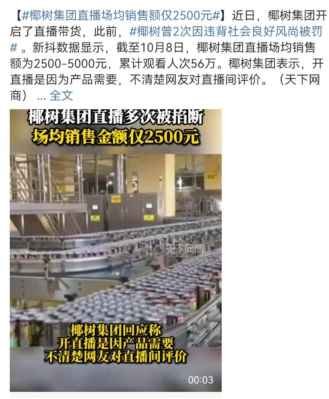 而椰树集团的公关团队表示开设直播只是因为产品需要,并不清楚网友对于直播间的评价以及相关情况。