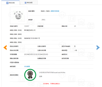 但是应该是时间太过久远,所以商标局官网上并未显示其具体申请时间,只能看到该商标现在仍在存续中,对应的类别和小项分别是29类的鱼罐头; 肉罐头。