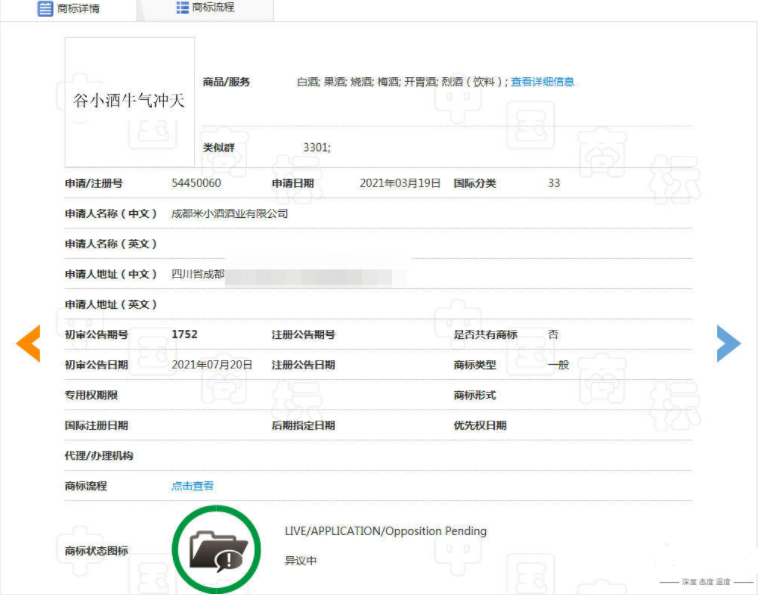 小知通过查询发现,“谷小酒·牛气冲天”商标并未在谷小酒公司名下,而是在其大股东成都米小酒酒业有限公司名下。目前,该商标正处于“异议中”。