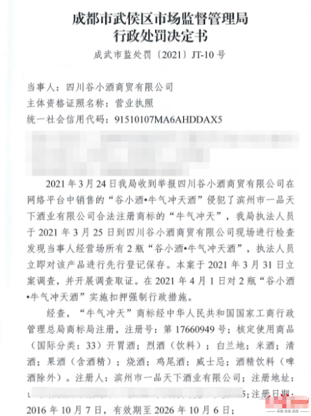 据谷小酒公司总经理刘飞介绍,一品天下公司曾向成都的市场监管部门进行投诉,并多次向谷小酒公司提出“50万授权费”的解决方案,但公司并未同意这笔授权费。2022年3月24日,谷小酒公司收到了一份由武侯区市场监督管理局下达的《行政处罚决定书》,称其公司销售的“谷小酒·牛气冲天”酒侵犯了一品天下公司的权益,被认定违法,罚款2835493.56元。
