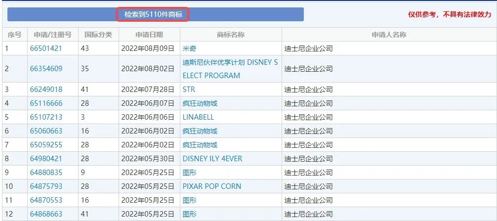 迪士尼作为公认的维权狂魔,在知识产权保护上可算是做到了极致,仅是中国境内就申请注册了5110件商标,其中包含了“米老鼠”“唐老鸭”“星黛露”“超人总动员”“疯狂动物城”“玩具总动员”等商标。