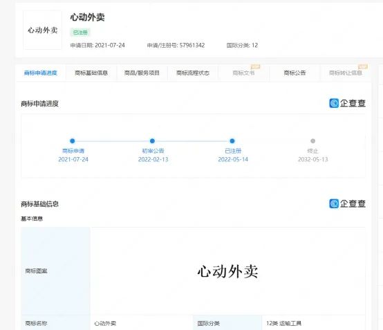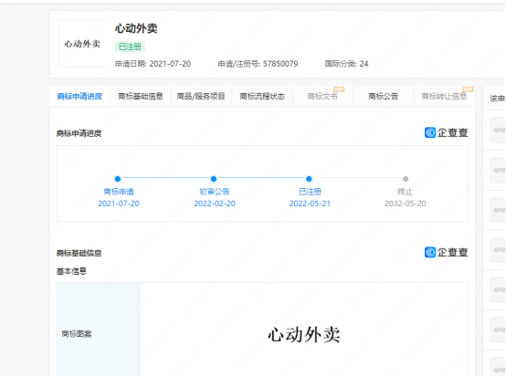 除了抖音注册抖音心动外卖外,还有一个名叫王远龙在2021年7月也注册了很多个“心动外卖”商标.而且有部分小项已经注册下来。
