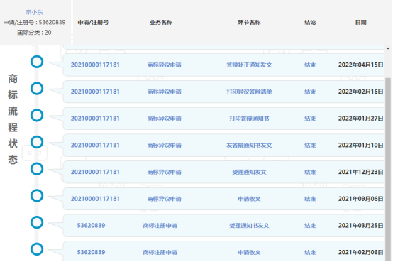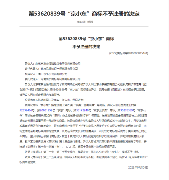 国家知识产权局商标局官网显示,某装饰公司于2021年2月6日分别申请了20类35类37类“京小东”商标,其中20类37类分别于2021年6月6日,2021年6月13日通过初审进入公告,于同年9月份收到异议申请并在12月份进行公告;