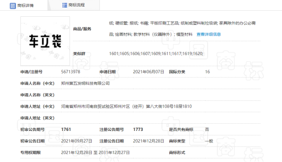 可见,郑州第五发明科技有限公司在2021年9月取得了“车立袋”的商标专用权,可以用于“纸质或塑料制垃圾袋”等产品的保护。这代表了,“车立袋”这个名字的所有人,即郑州第五发明科技有限公司,在核定使用的商品上拥有了独占性的使用“车立袋”的权利,和在指定流通领域中受到法律保护的权利。非该商品不准使用、不准仿制、不准以赢利为目的在任何场合借用等,违者将受到法律制裁,商标注册人有权使用法律手段制止、制裁一切侵犯注册商标的行为,以保护自身的合法权益。
