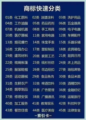 7.按商标局分类书,商标查询和注册是分45个类别(行业)的。