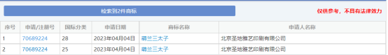 近日,萌兰三太子商标已经被抢注,“萌兰三太子”商标被北京某印刷公司申请注册,国际分类分别为25和28,商品/服务包括服装、玩具等。当前商标状态均为等待实质审查。